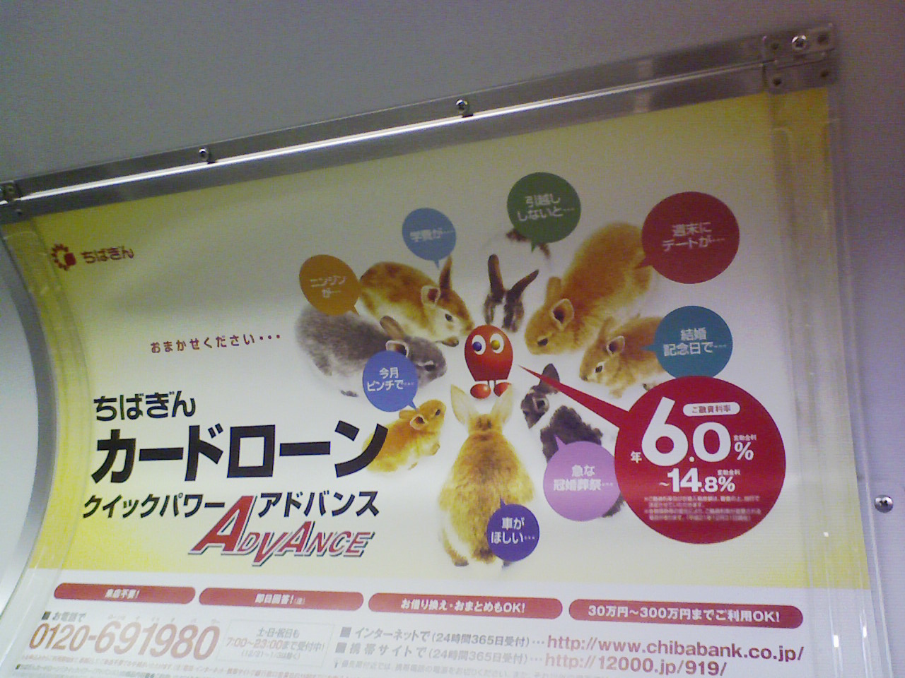 総武線の中の広告。 とってもかわいい広告があるから、絶対チェックするよう言われて、なかなか見つけられなかったんだけど、ついに発見。 写真撮影もできた。 ウサギたちが集まって、 「車がほしい・・・」 「今月ピンチで・・・」 「引越ししないと・・・」 などと、やけに現実的なことを言っているのに、一羽だけ、 「ニンジンが・・・」 と、ある意味ウサギにとって、もっとも現実的なことをつぶやいている。 今のところ、4コマ漫画掲載中 『ネズミに会いに』(裕子の小説置場☆) |